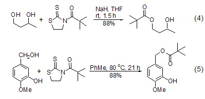 1,3-thiazolidine- the corresponding ester [6~8] can be easily obtained by co-heating 2-thione amide derivatives with alcohol. a high degree of regioselectivity can be achieved using this method when different alcohols are present simultaneously. the selectivity is determined on the one hand by the steric hindrance of the acyl segment in the amide derivative, with tert-pentanoyl giving the best results. on the other hand, it depends on the type of hydroxyl group, and the order of activity is primary alcohol > secondary alcohol > phenol (formula 4, formula 5) [7,8].