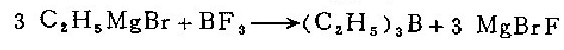 1. in a 1-liter three-necked flask equipped with a mercury-sealed stirrer, reflux cooler, dropping funnel and air guide, put 72 grams (3.0 grams atoms) of magnesium chips and 250 ml of anhydrous water. butyl ether. under nitrogen protection, slowly add 500 ml of anhydrous butyl ether solution containing 327 g (3.0 mol) of ethane to prepare grignard reagent. the reaction started very violently, so the flask must be immersed in a cold water bath to cool, and then 400 ml of butyl ether solution containing 61 g (0.9 mol) boron trifluoride was added dropwise within 4 hours. afterwards, heat at 70°c for 2 hours. (after the reaction is completed, replace the condenser with a ground glass stopper, and the unsealed stirrer with a short fractionator. . such changes in the apparatus should be carried out quickly with a rapid nitrogen flow to avoid exposure of the mixture to air). directly distill the reaction mixture and collect the fractions at 94—97°c to obtain 65 grams (74%) of crude triethylboron.