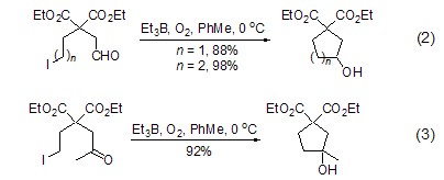 triethylboron combined with oxygen it can also realize the addition reaction of intramolecular alkane radicals to aldehydes and ketones without the participation of tin. for example, ω-iodoaldehyde can effectively undergo intramolecular formation under the induction of 10 times triethylboron. ring reaction (formula 2) [2], ω-iodoketone can also obtain the ring-forming product in high yield under 20 times of triethylboron induction (formula 3 ).